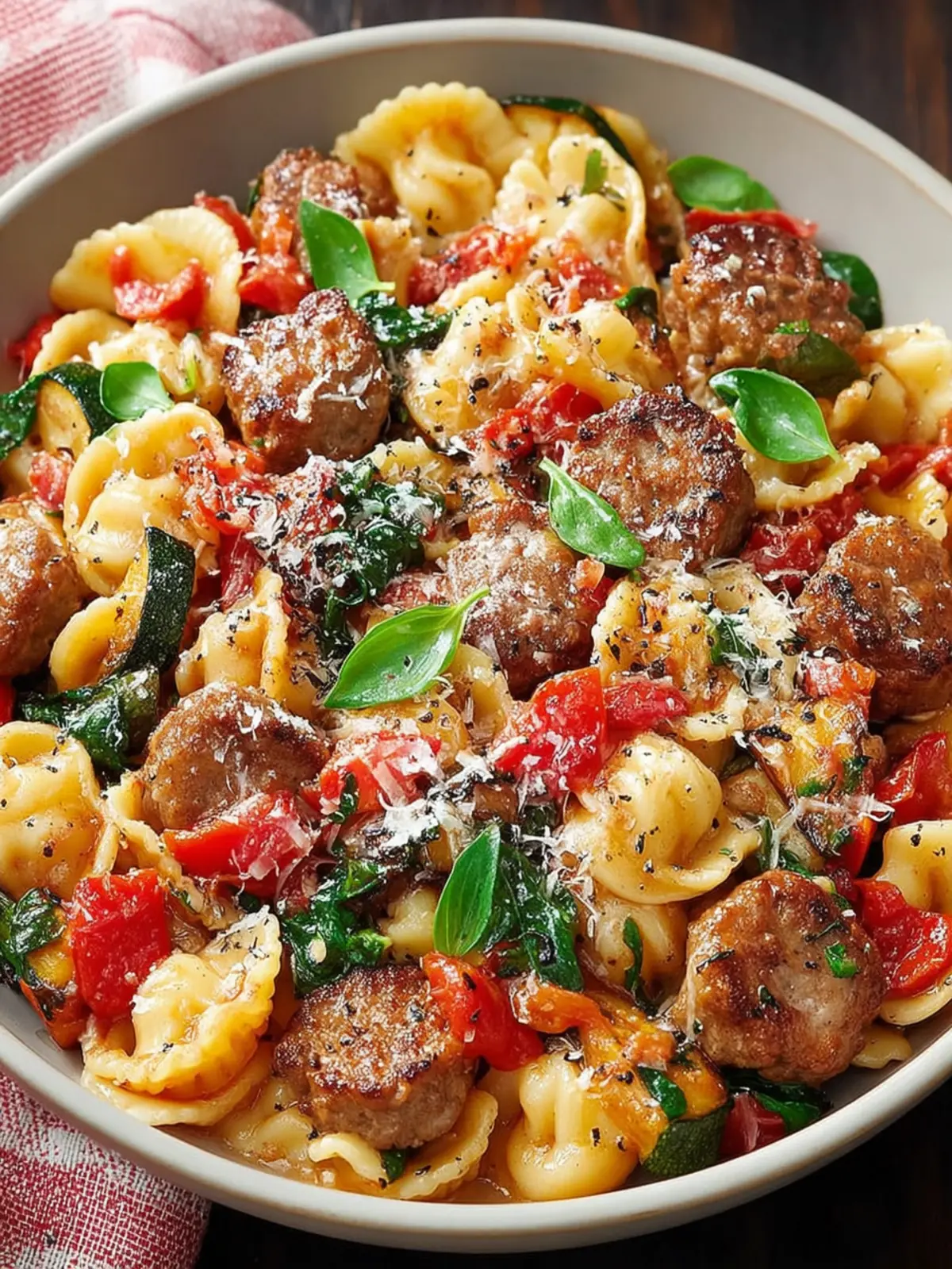 A hearty pasta dish made with Italian sausage and fresh vegetables.