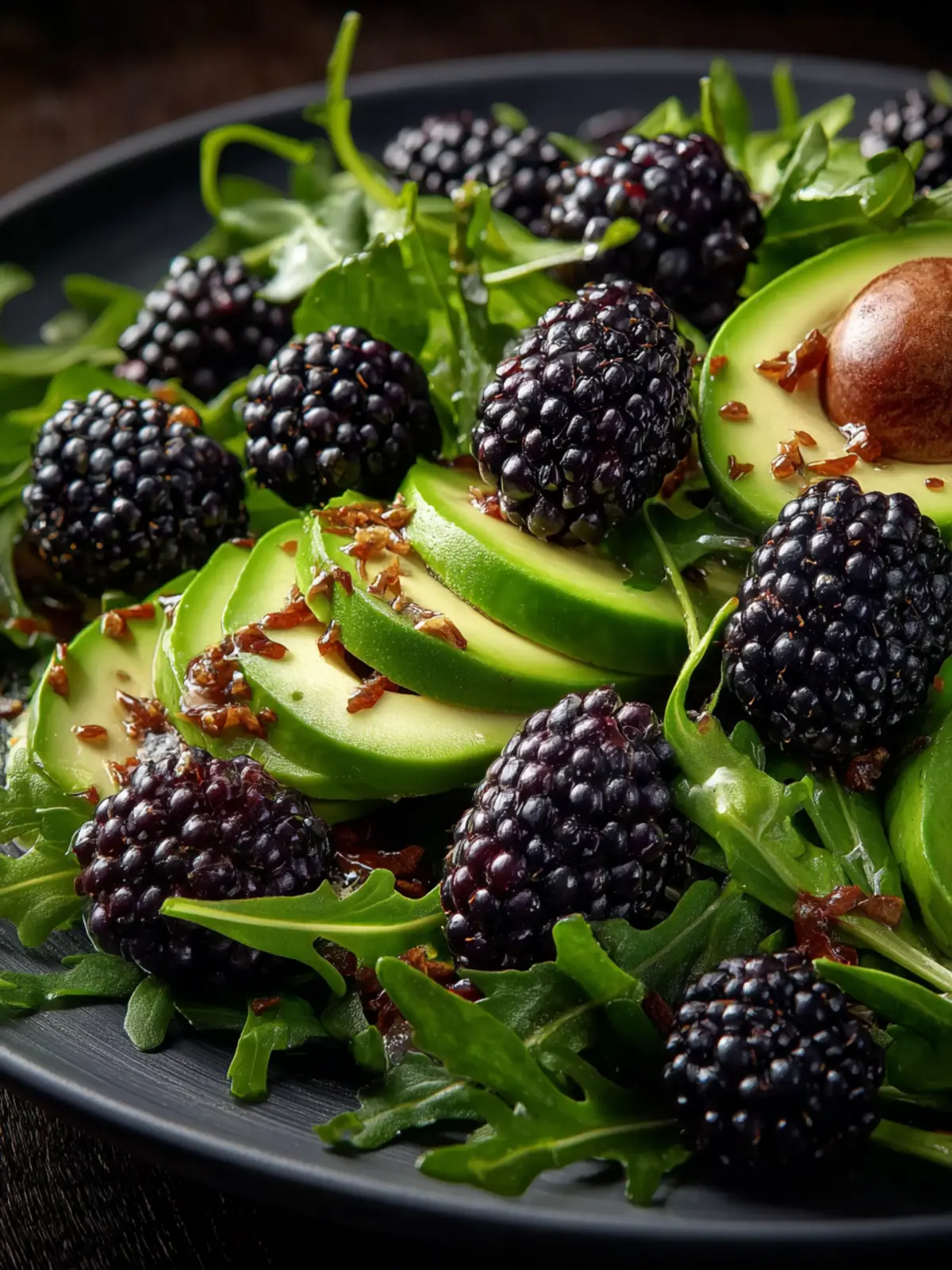A refreshing salad with arugula, blackberries, avocado, and a light vinaigrette.