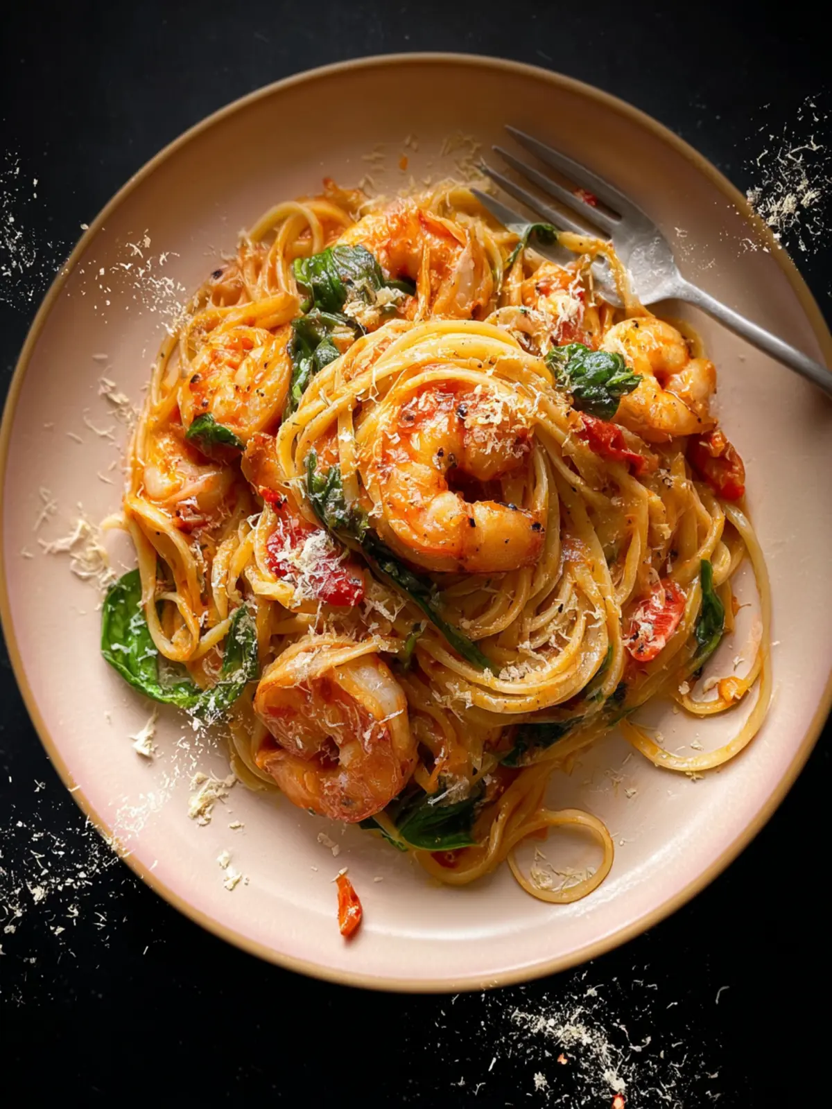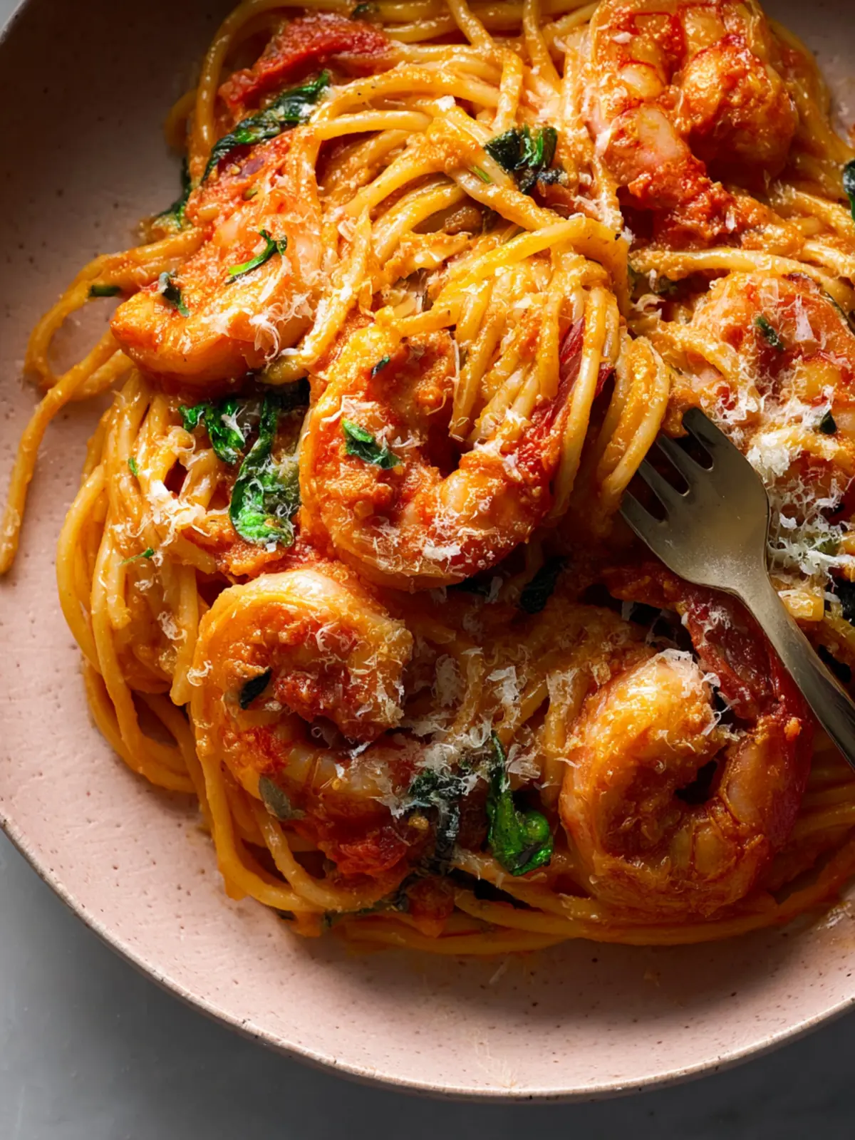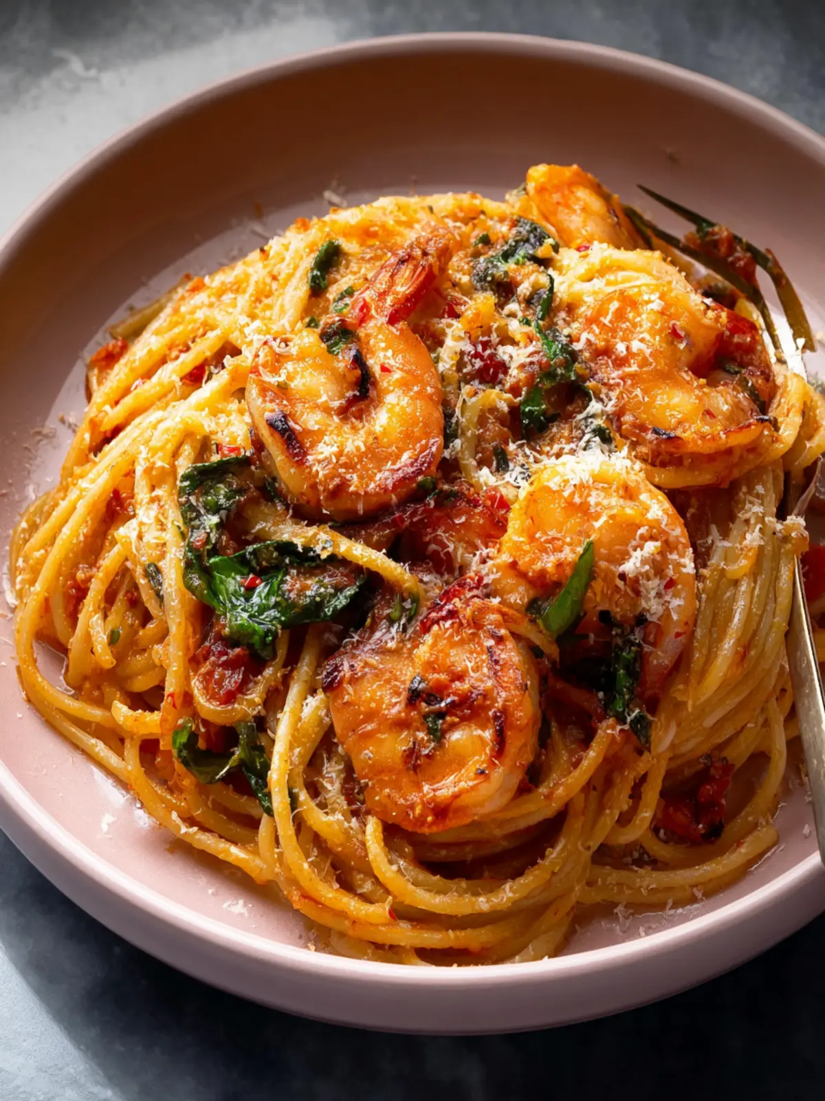 A delicious shrimp pasta dish with a creamy tomato sauce and fresh spinach.