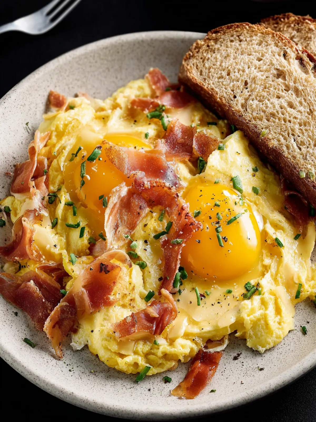 A delicious and creamy scrambled egg dish topped with crispy prosciutto and melted cheese.