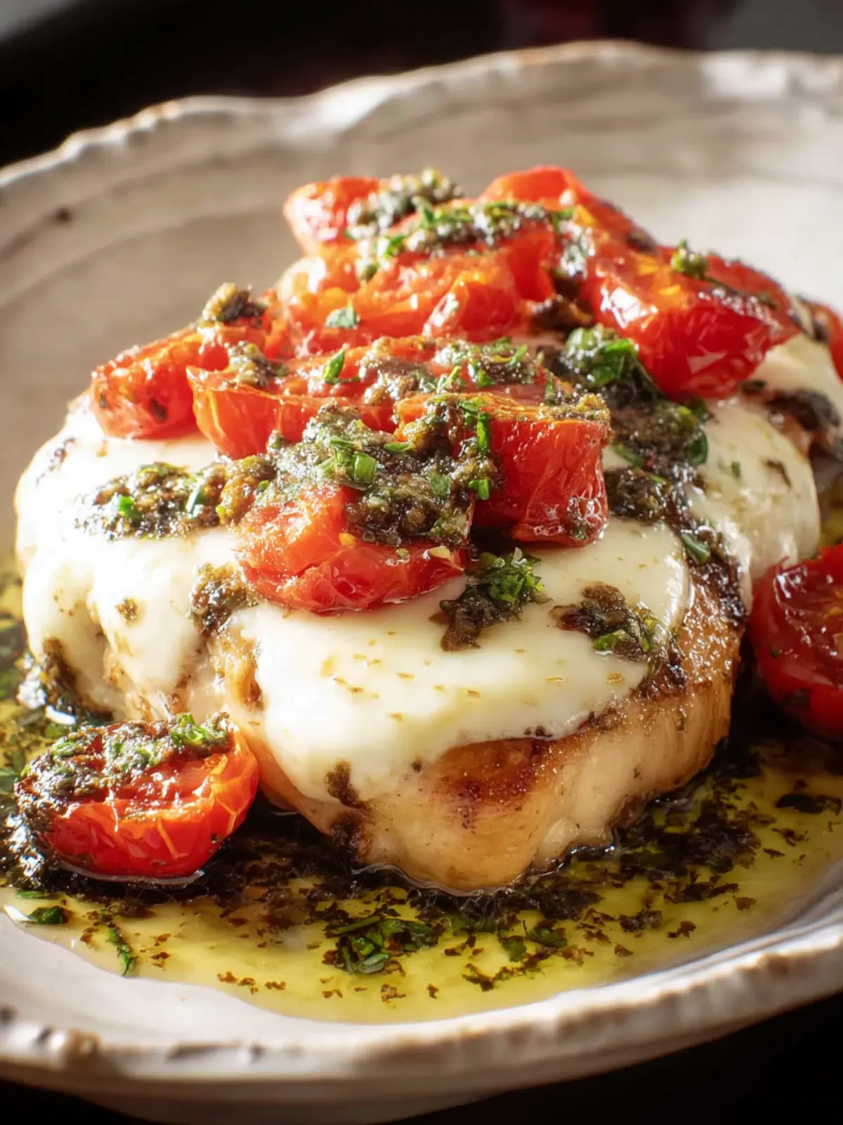 A delicious and easy chicken bake topped with pesto, tomatoes, and melted mozzarella cheese.