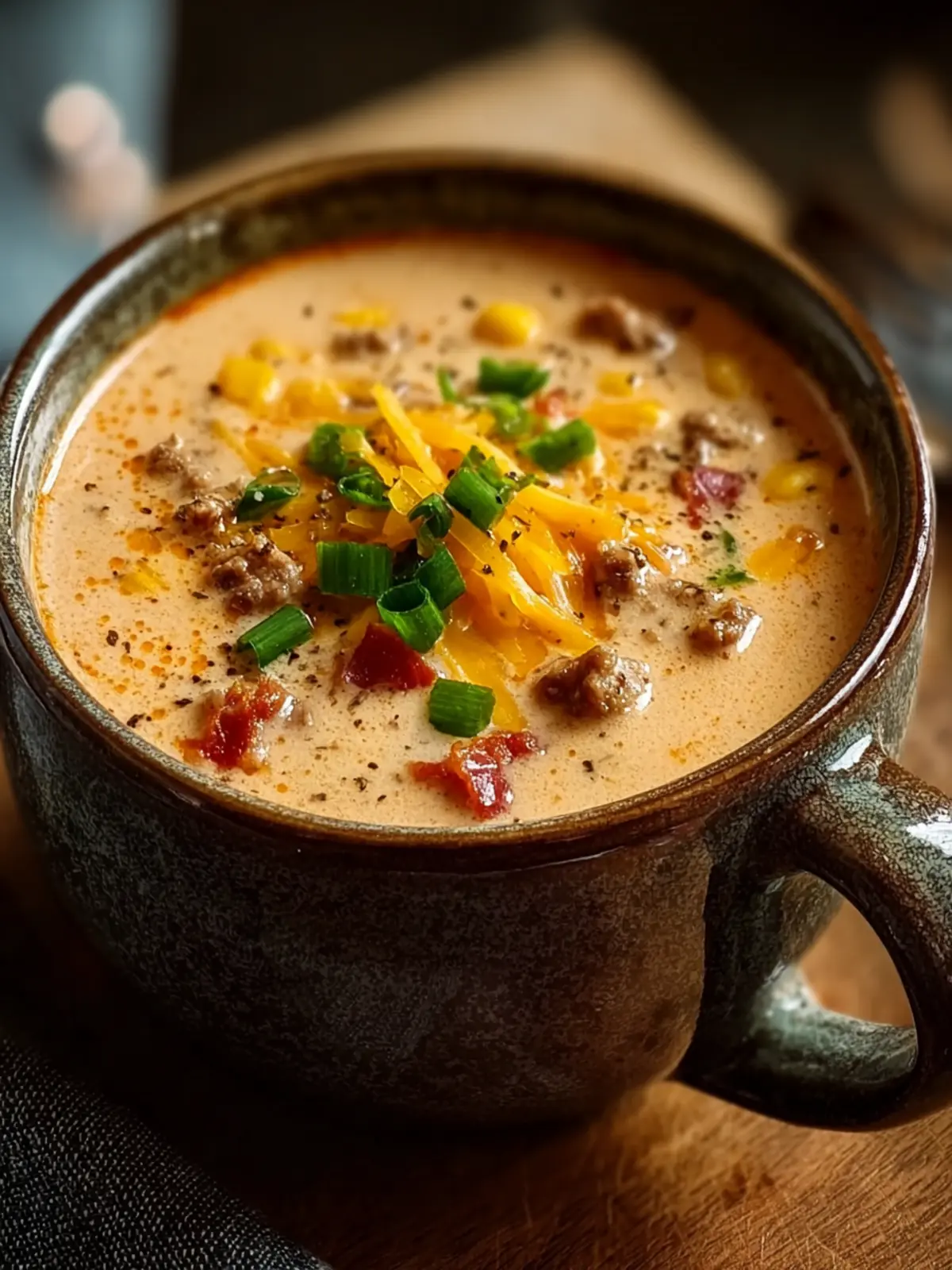 A hearty and creamy soup made with ground beef, potatoes, and a blend of flavorful ingredients.