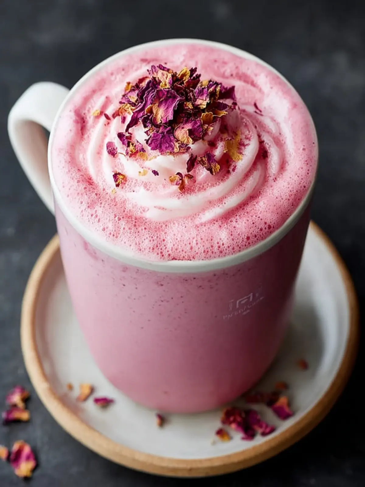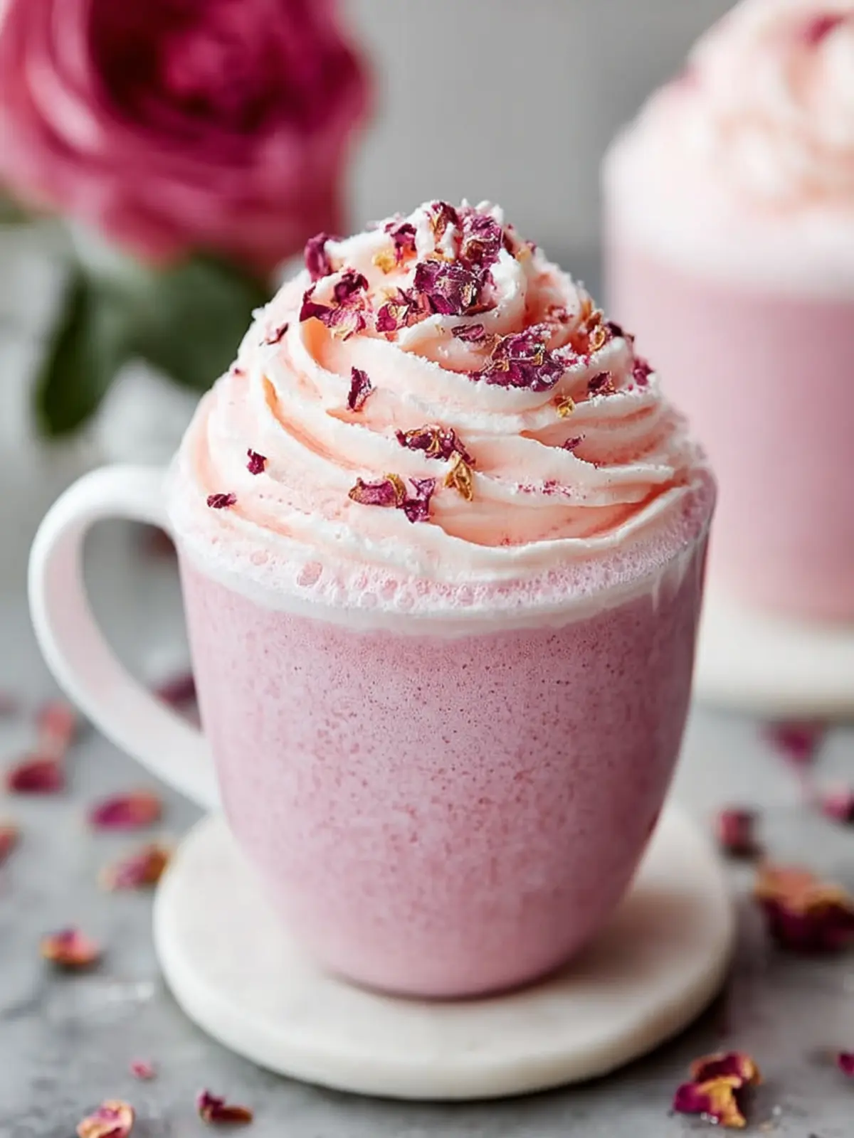 - Pour into a mug and top with foam or rose petals.