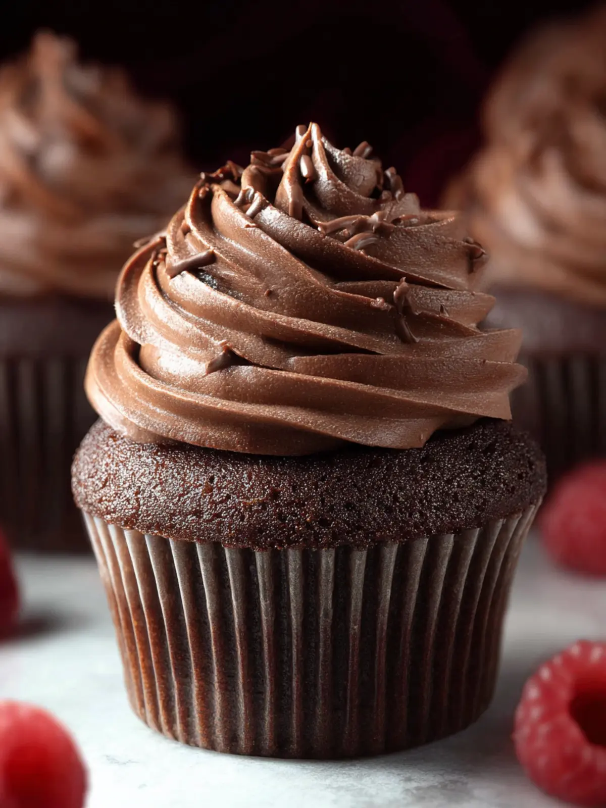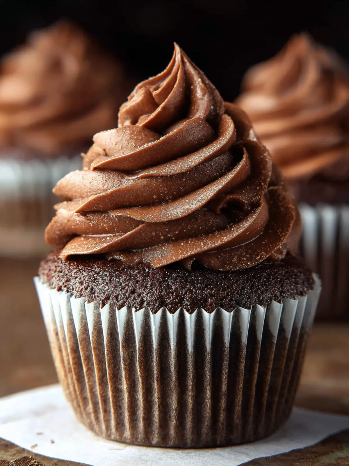 Delicious and moist chocolate cupcakes topped with a rich buttercream frosting.