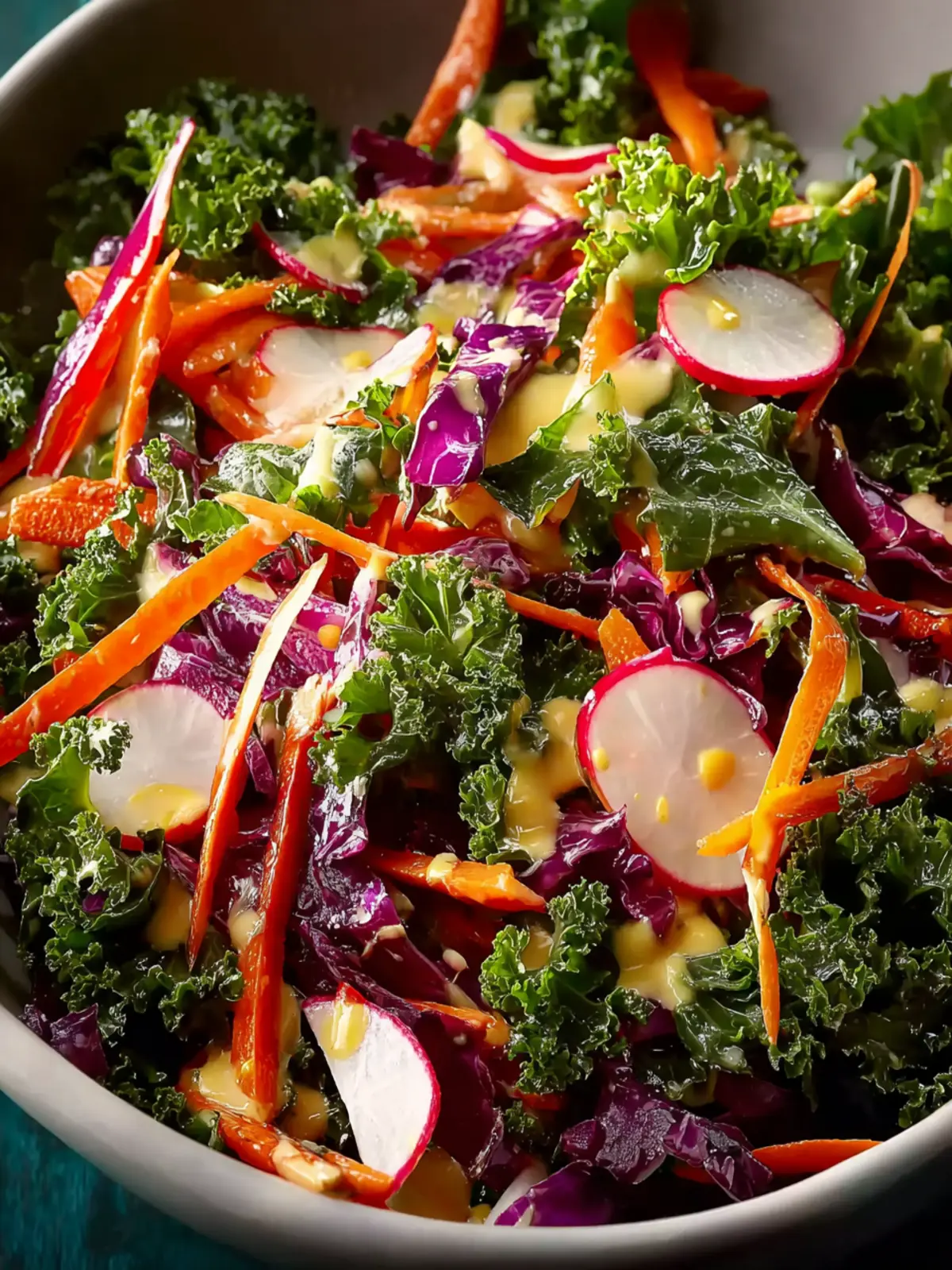 - Combine massaged kale, shredded carrots, thinly sliced radishes, and chopped red onion in a large mixing bowl.