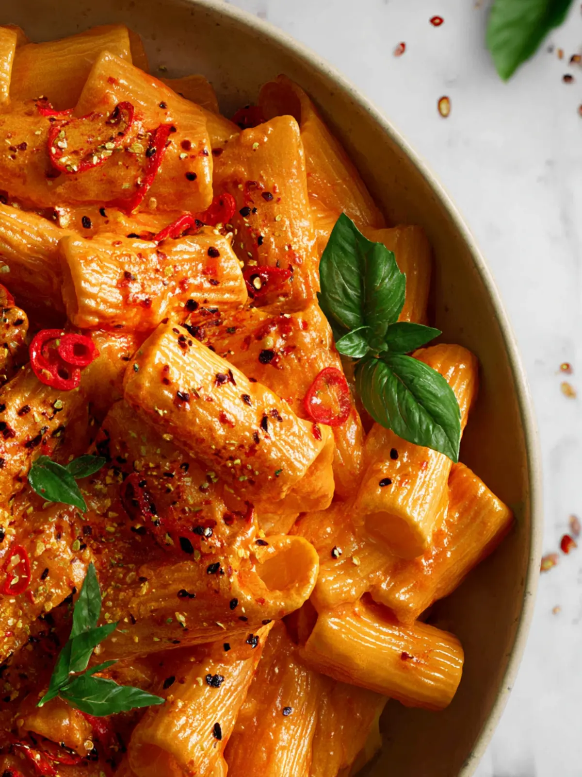 - Pour the sauce over the cooked pasta and toss to coat evenly. Garnish with fresh basil and crushed red pepper flakes if desired. Serve warm.