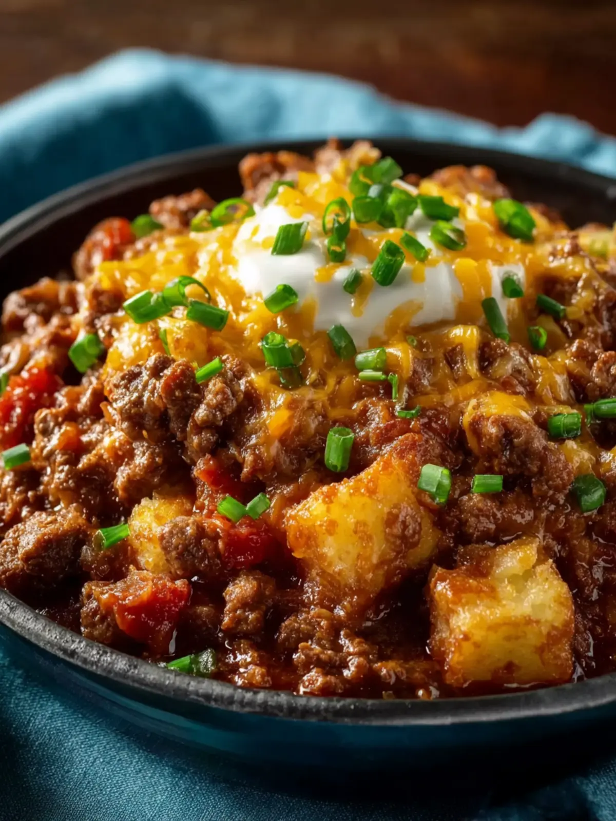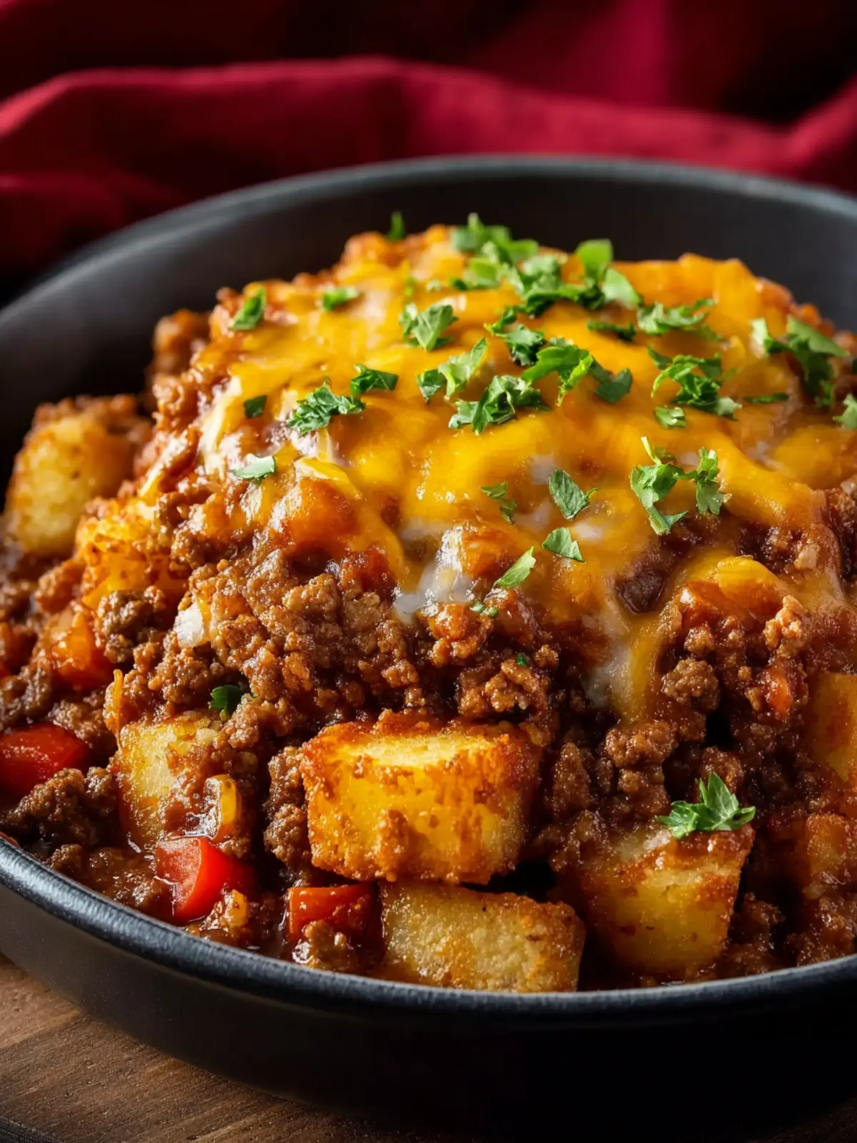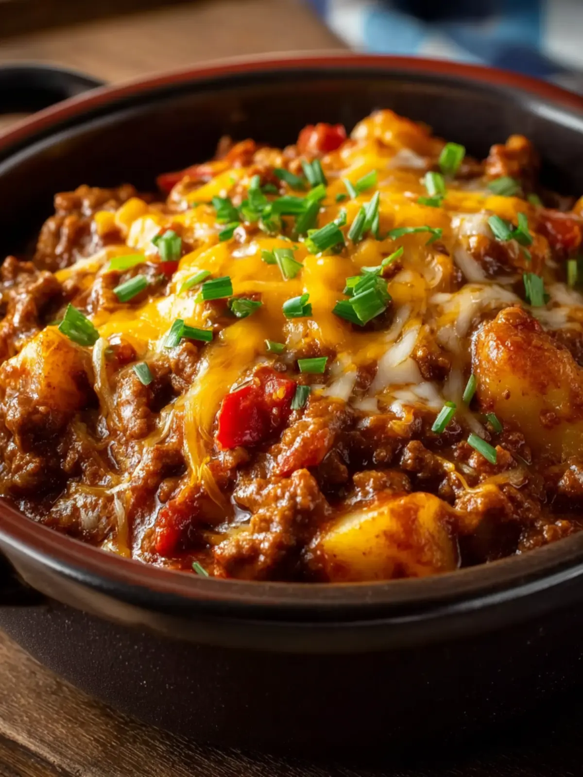 A comforting slow cooker casserole made with ground beef, potatoes, and cheese.