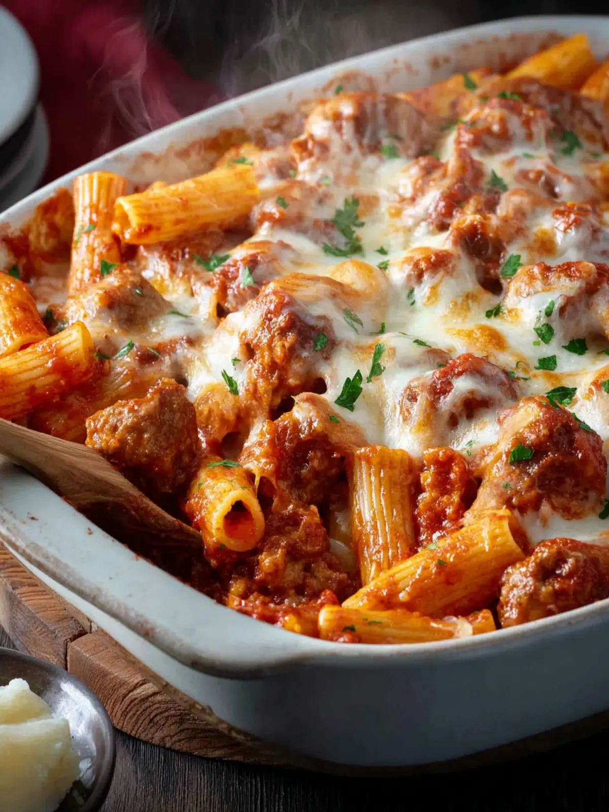 A comforting baked ziti dish with Italian sausage, creamy cheeses, and marinara sauce.
