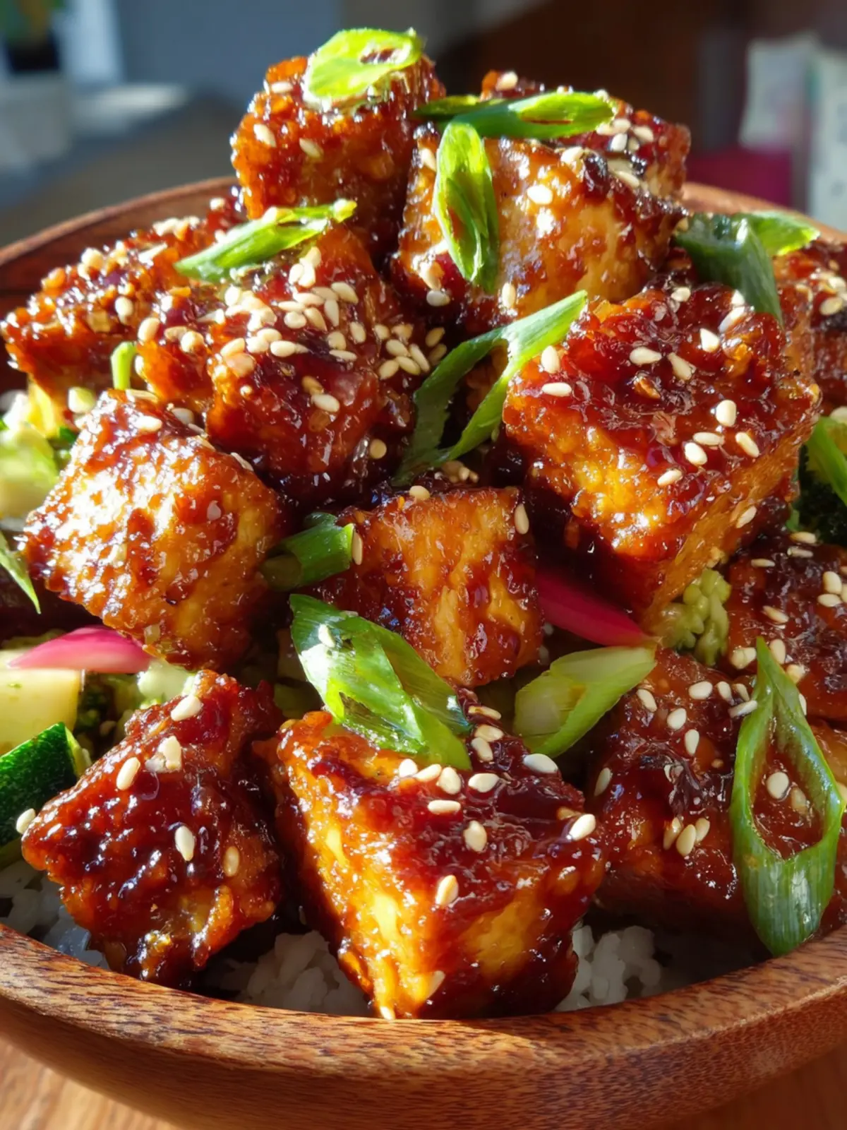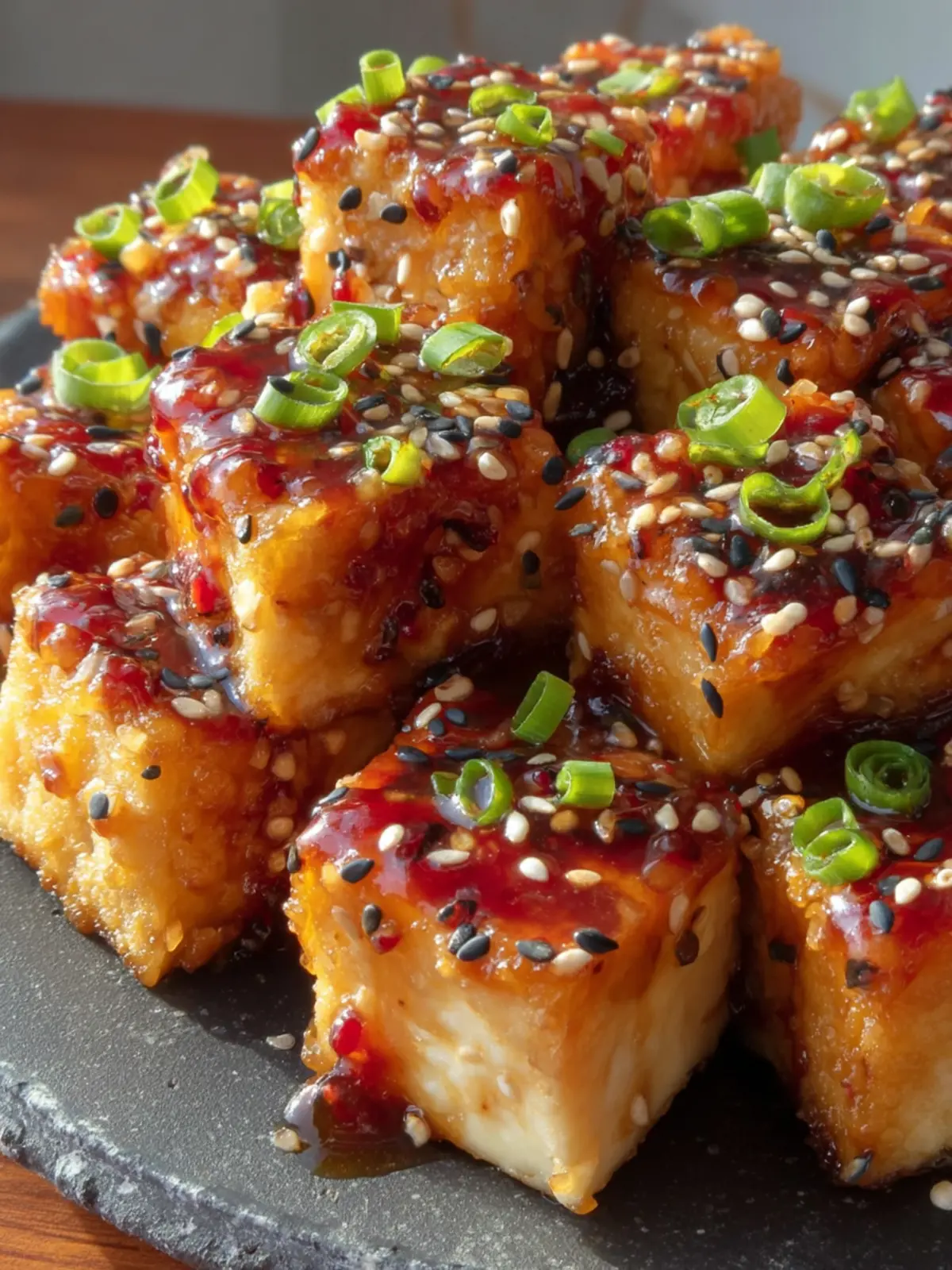 Finish your dish with toasted sesame seeds and chopped green onions. Not only do they add a pop of color, but they also bring in extra flavor and texture, completing your sticky teriyaki tofu experience.